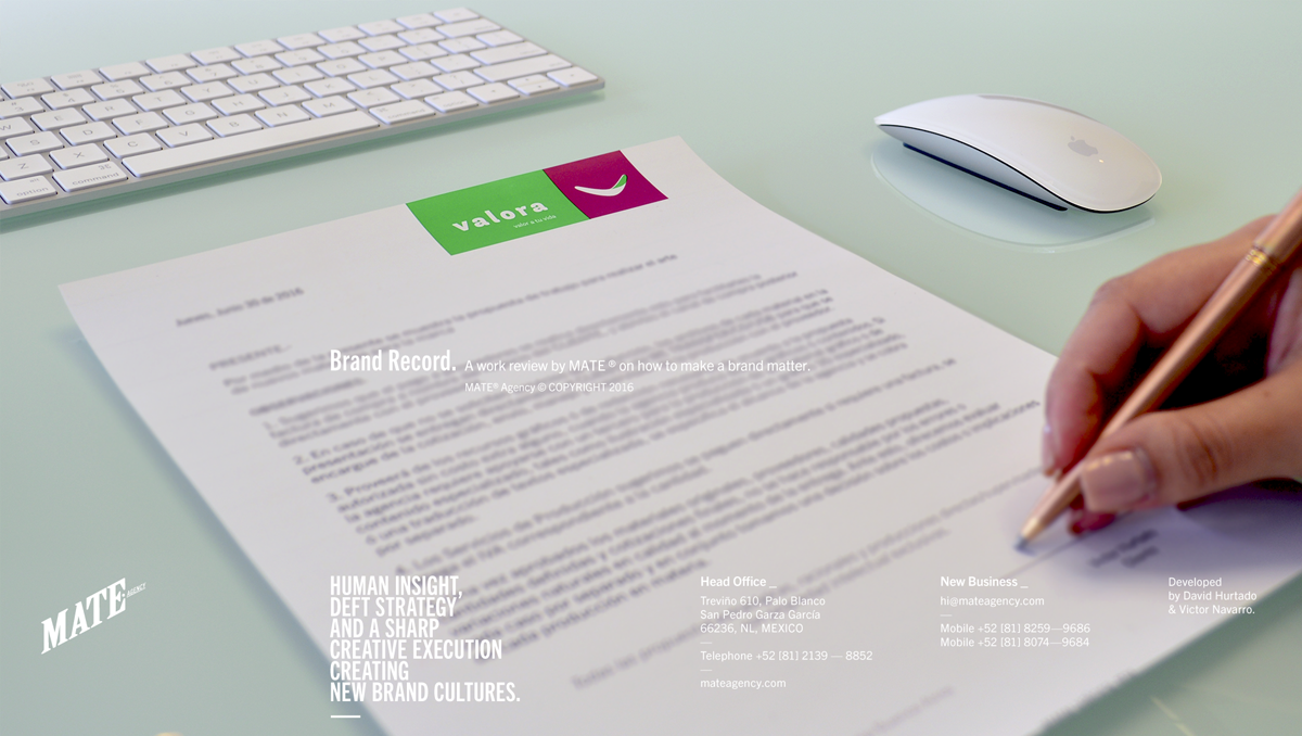 Por medio de un programa de branding, herramientas institucionales y experiencia de venta, creamos y establecimos una nueva marca, una promesa activa y un territorio de comunicación que definió una voz convocadora y confianza en cada material de contacto, sucursales y locales de servicio. Este proyecto de relanzamiento implicó el crear un nuevo código y plataforma de servicio así como una nueva cultura de marca que impulsara a los socios, colaboradores y empleados de Valora® hacia un crecimiento nacional.
